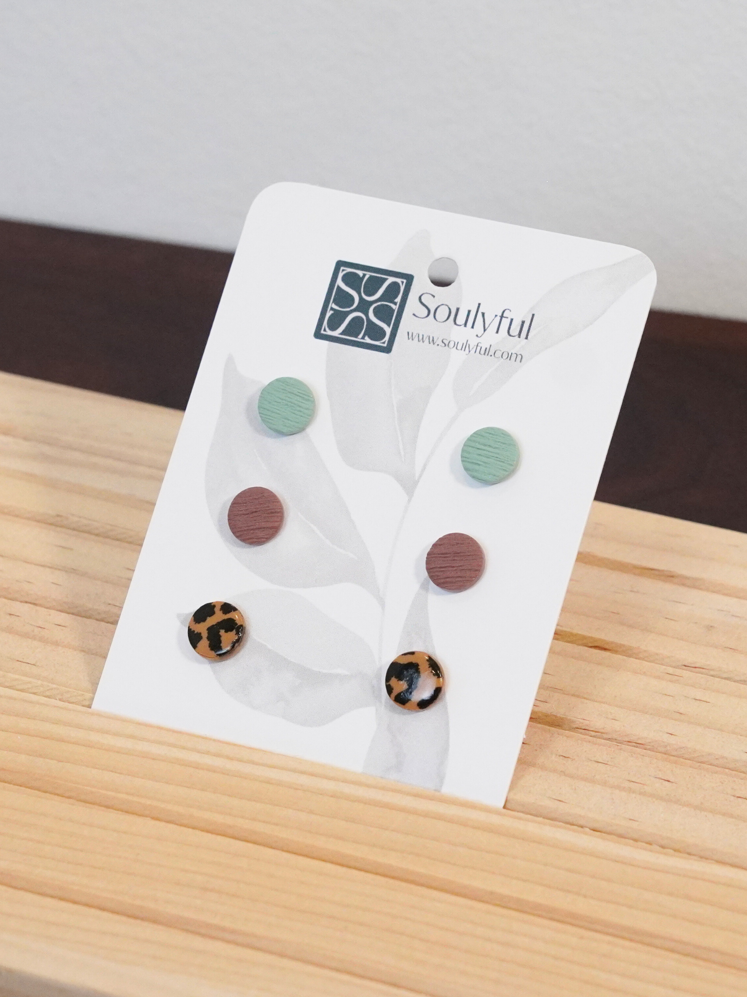 Das matte Finish von Sage und Altrosa wirkt dezent und natürlich, während der glänzende Leo-Stecker einen modernen Akzent setzt. Durch ihre minimalistische Größe eignen sie sich perfekt für den Alltag, für das Büro oder als Ergänzung zu größeren Statement-Ohrringen.