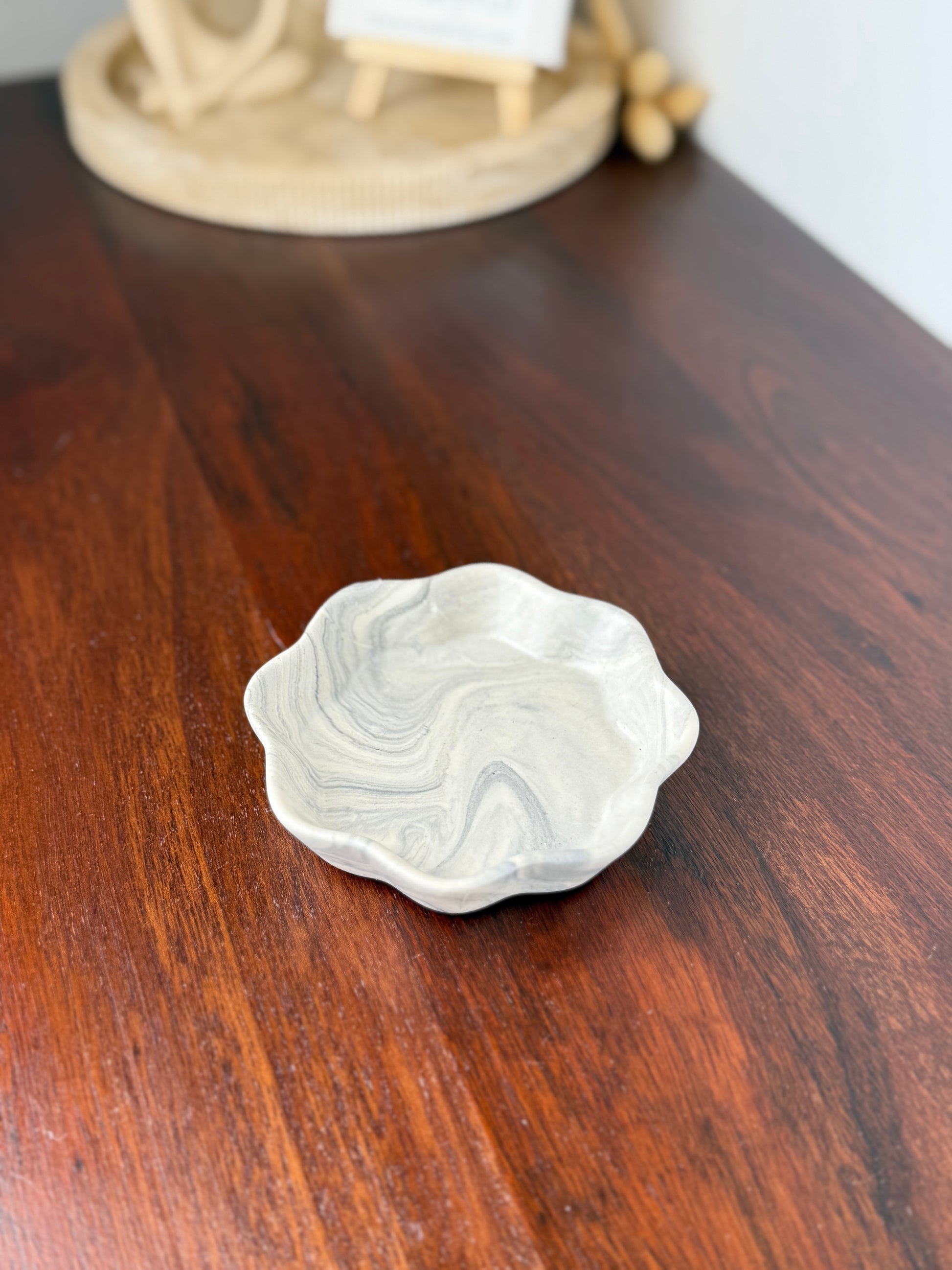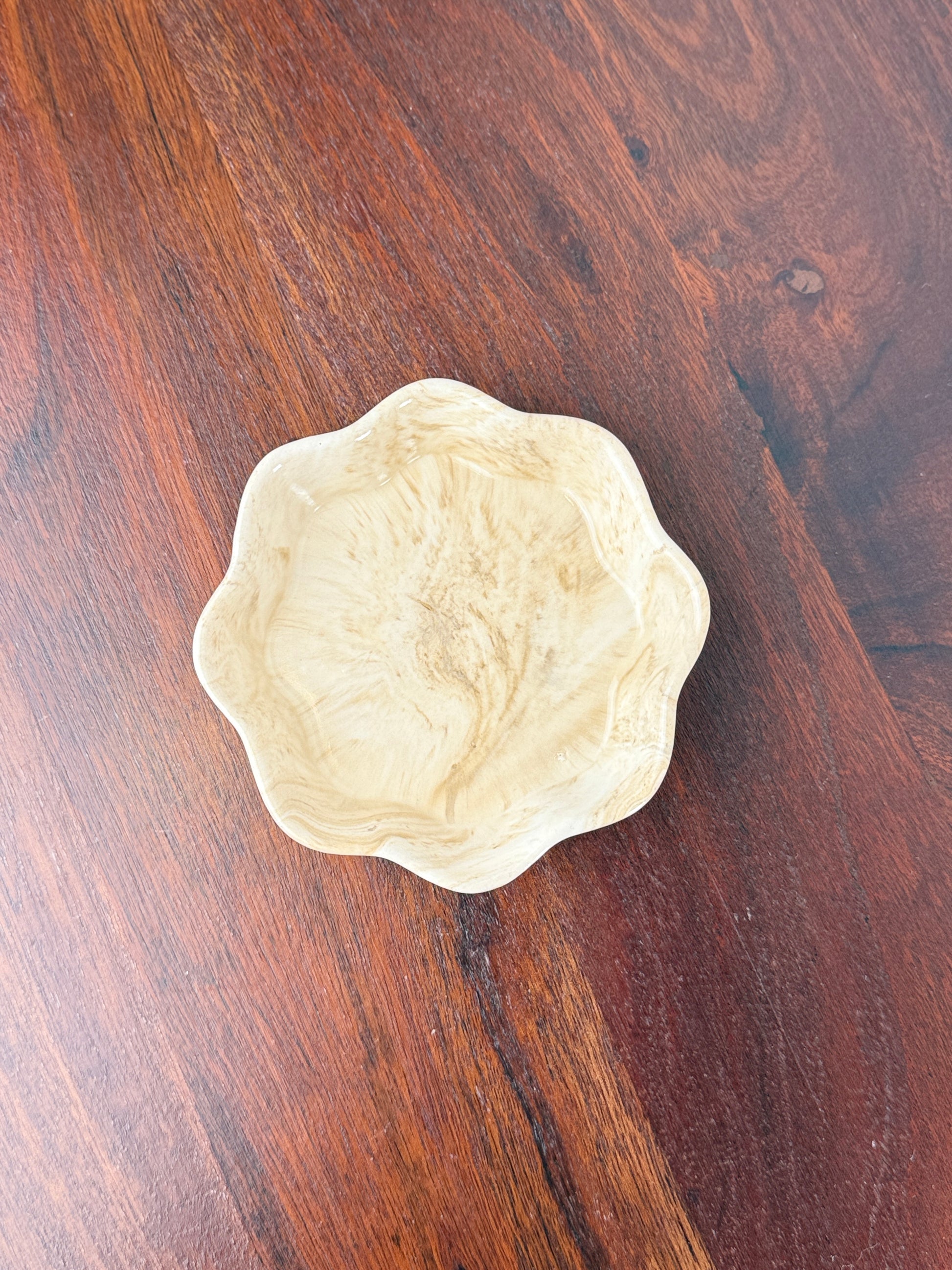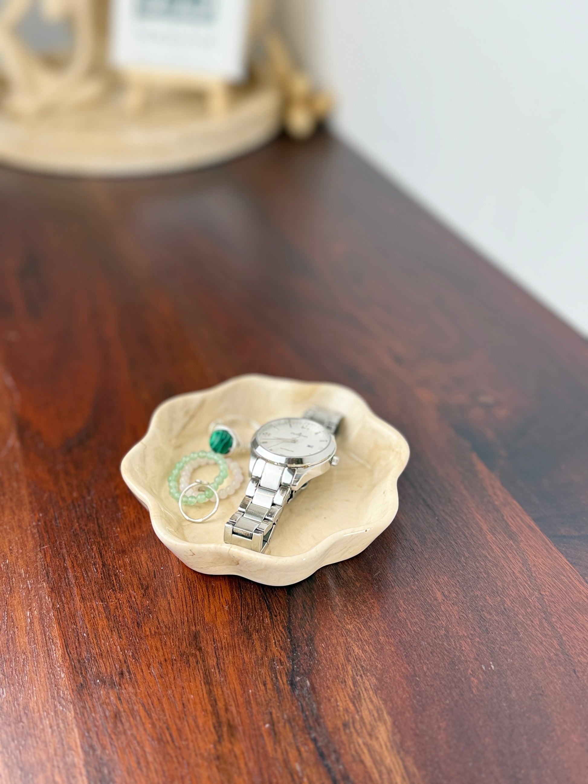 Mit einem Durchmesser von 11 cm und einer Höhe von 2,5 cm bietet Blossom den idealen Platz für Schmuck, Schlüssel, kleine Alltagsbegleiter oder dekorative Akzente. Die handgegossene Oberfläche mit ihrer dezenten Wellenstruktur macht jede Schale zu einem individuellen Unikat – perfekt für alle, die liebevolle Details und hochwertige Handarbeit schätzen.