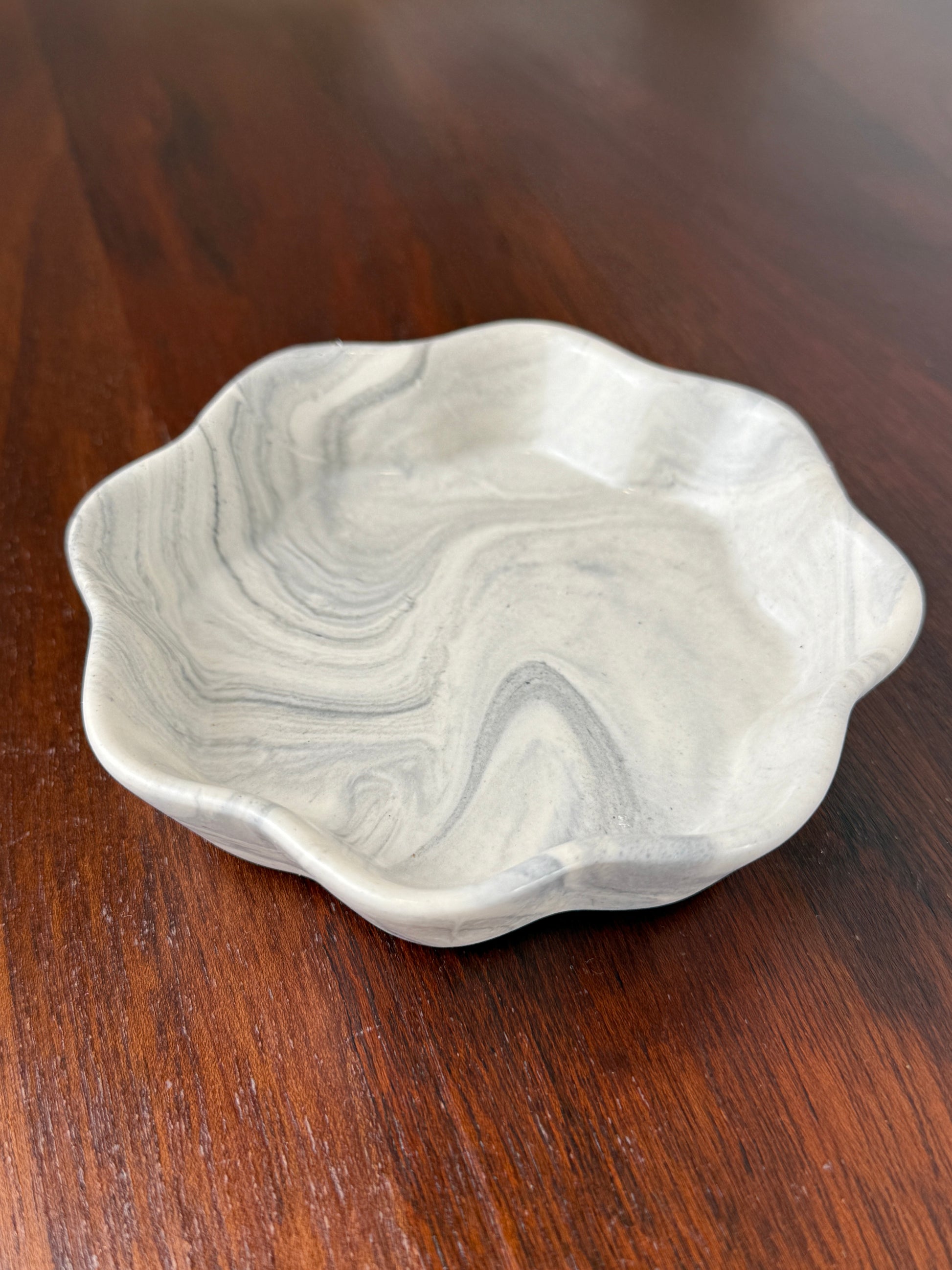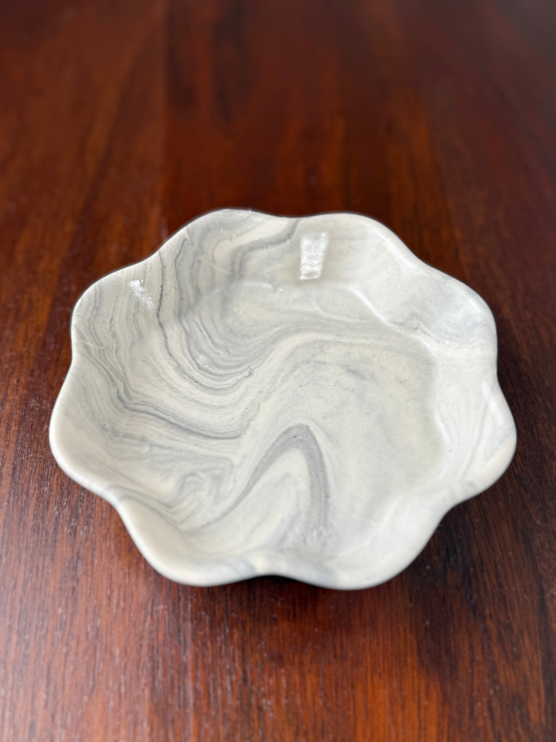 Blossom ist eine sanft geschwungene Ablageschale aus hochwertigem Jesmonite, deren organische Form an eine aufgeblühte Blütenkrone erinnert. Die feine Marmorierung und die weich verlaufenden Konturen verleihen ihr eine natürliche Eleganz, die sich mühelos in jedes Interieur einfügt.