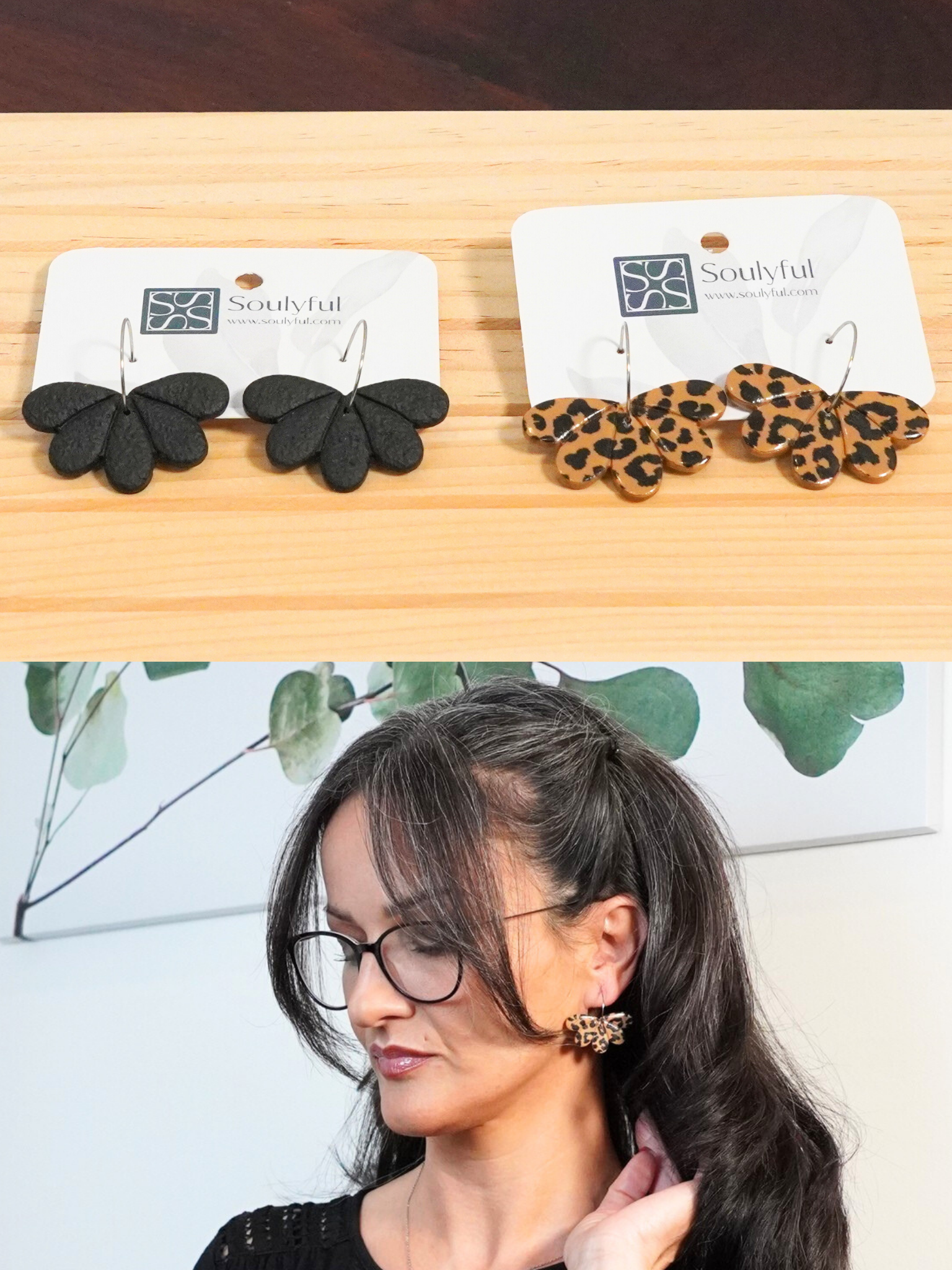 Die Variante in mattem Schwarz wirkt elegant und zeitlos, während die Leo-Version mit glänzender Oberfläche für einen modernen, selbstbewussten Akzent sorgt. Beide Varianten sind wunderbar leicht und lassen sich mühelos den ganzen Tag tragen – ob als Eyecatcher im Alltag oder als feminines Statement am Abend.