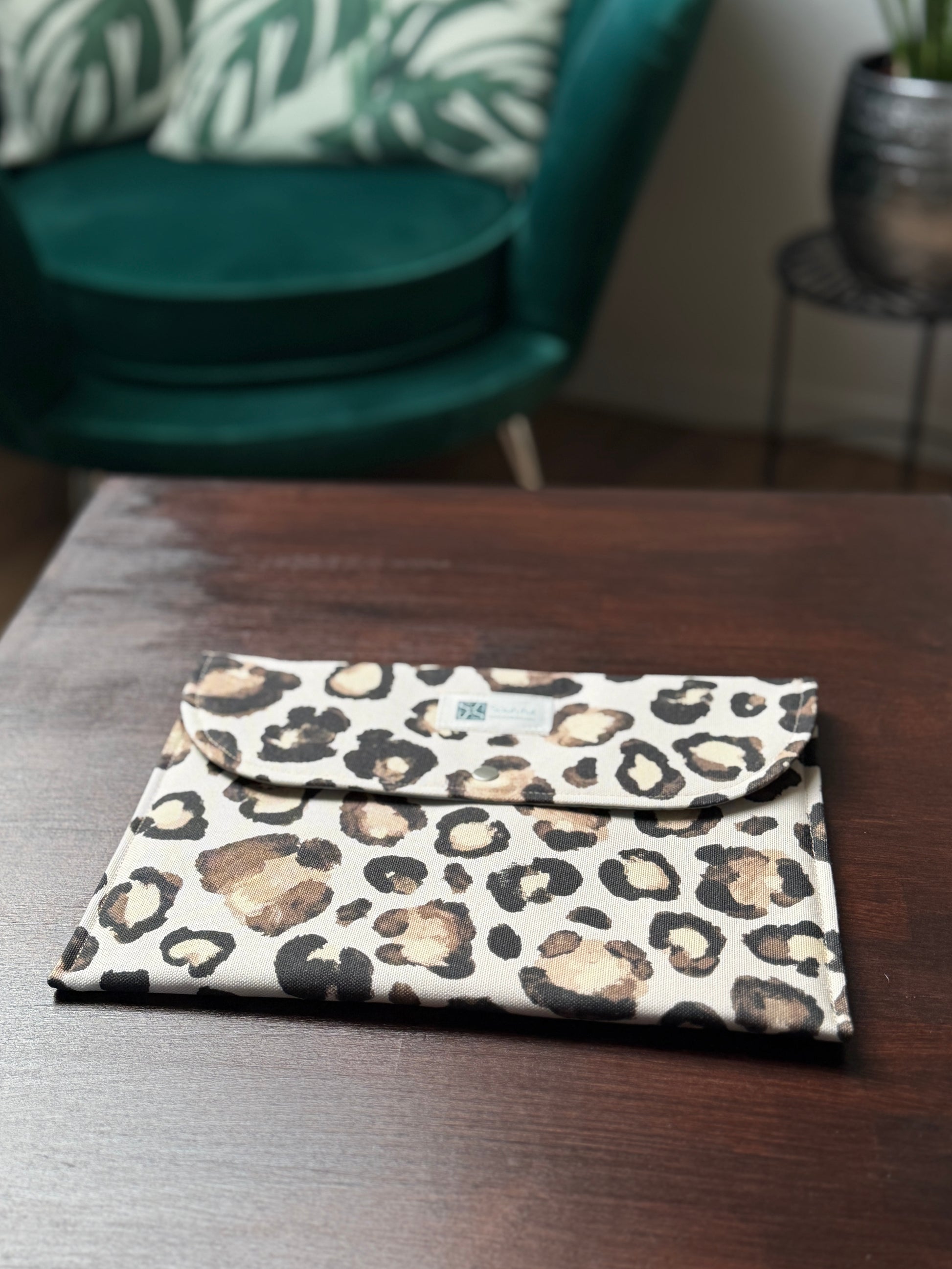 Im Inneren ist die Pouch wattiert und mit einem glatten Baumwollfutter in der Farbe Petrolsalbei verarbeitet. Das wattierte Innenleben schützt den Inhalt zusätzlich und setzt einen dezenten, hochwertigen Farbkontrast zum äußeren Leo-Design.