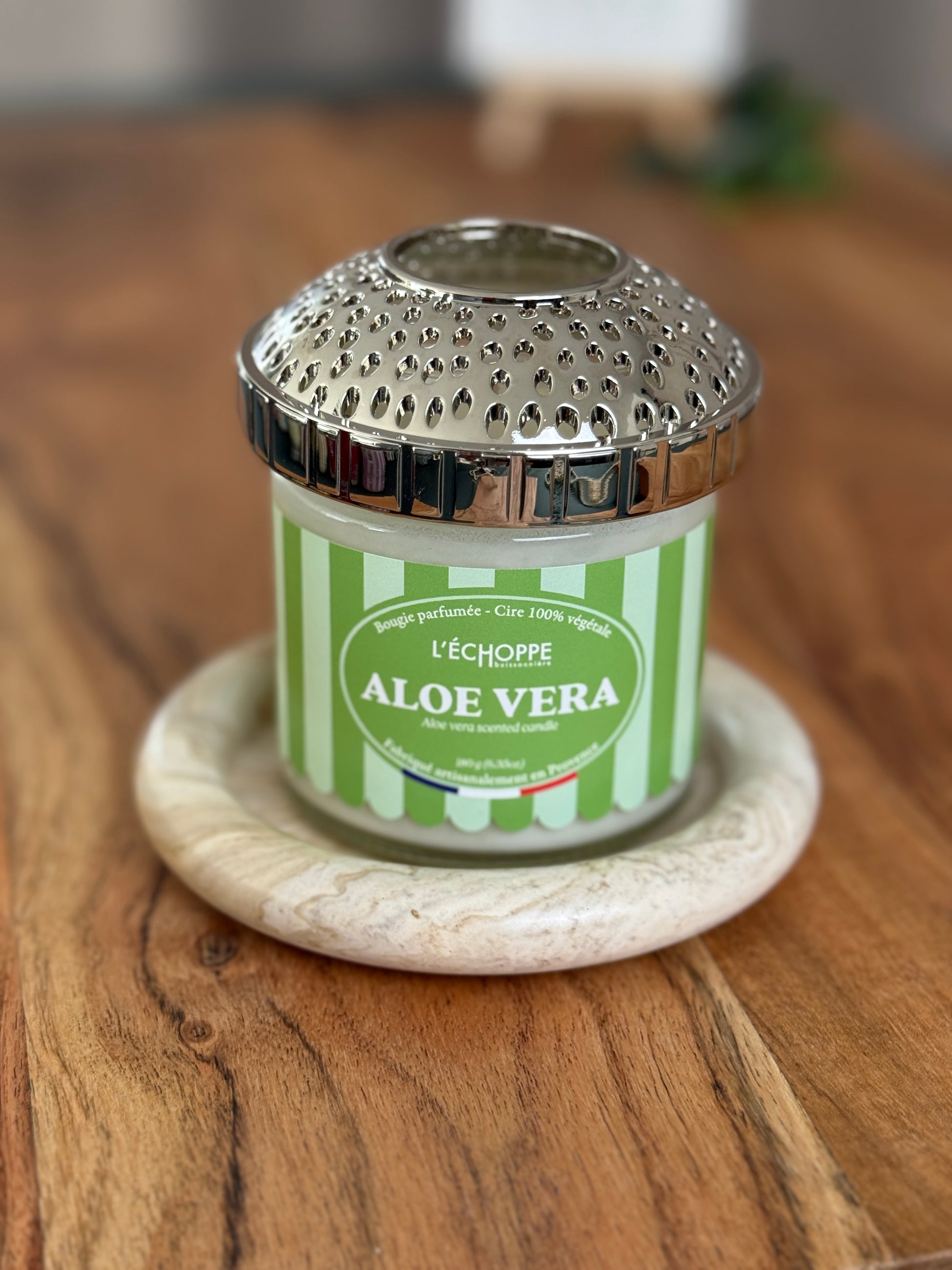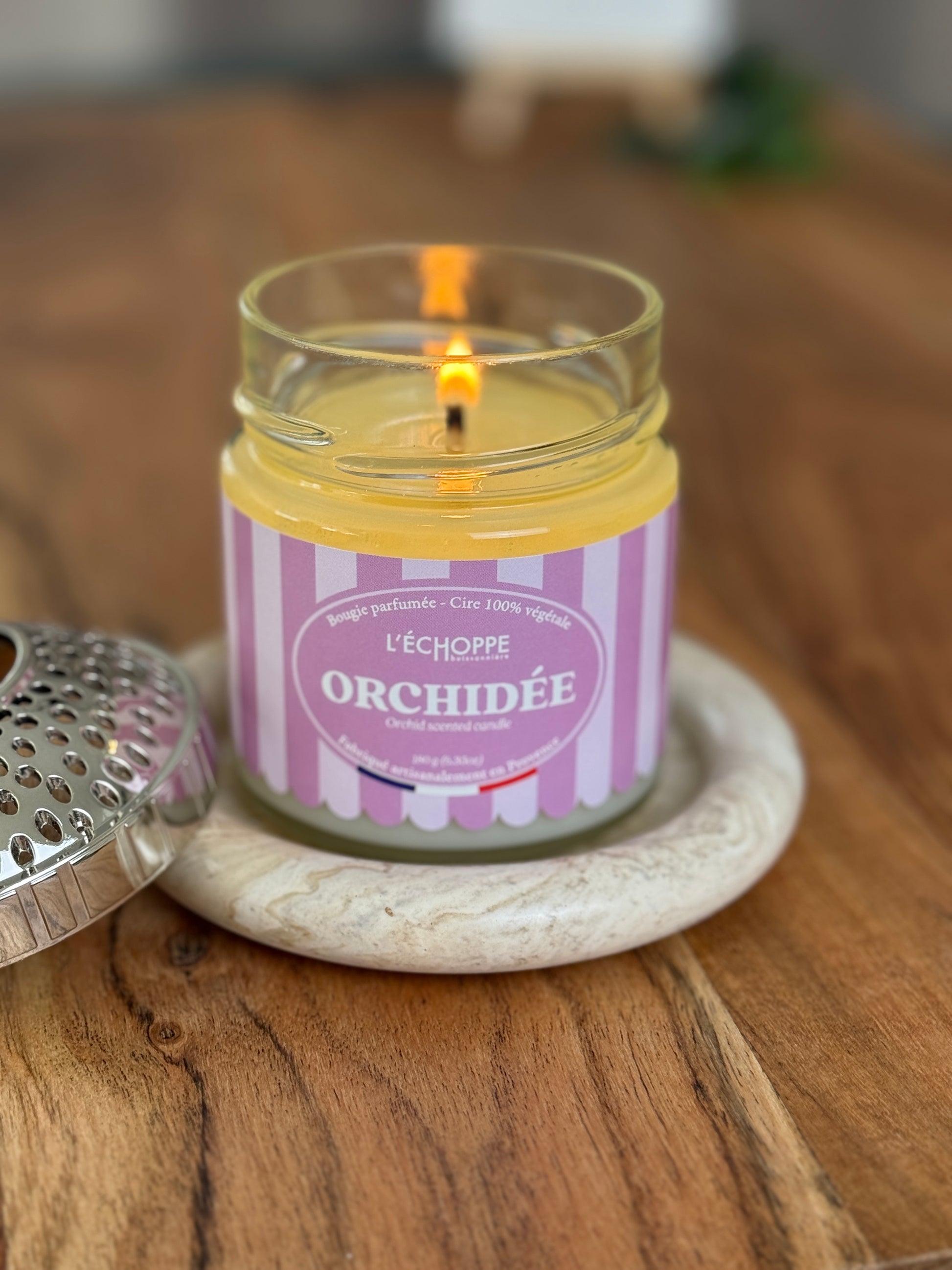 Das versetzt angeordnete Lochmuster aus hochwertigem Metall ist kein reines Design-Element – es hat einen klaren Zweck. Die Perforationen ermöglichen eine gleichmäßige Luftzufuhr zur Flamme, sodass die Kerze ruhiger und stabiler brennt. Das reduziert Rußbildung, verhindert Tunnelbildung und sorgt dafür, dass das Wachs vollständig und gleichmäßig abbrennt. Kurz gesagt: die Kerze brennt länger, sauberer und schöner.