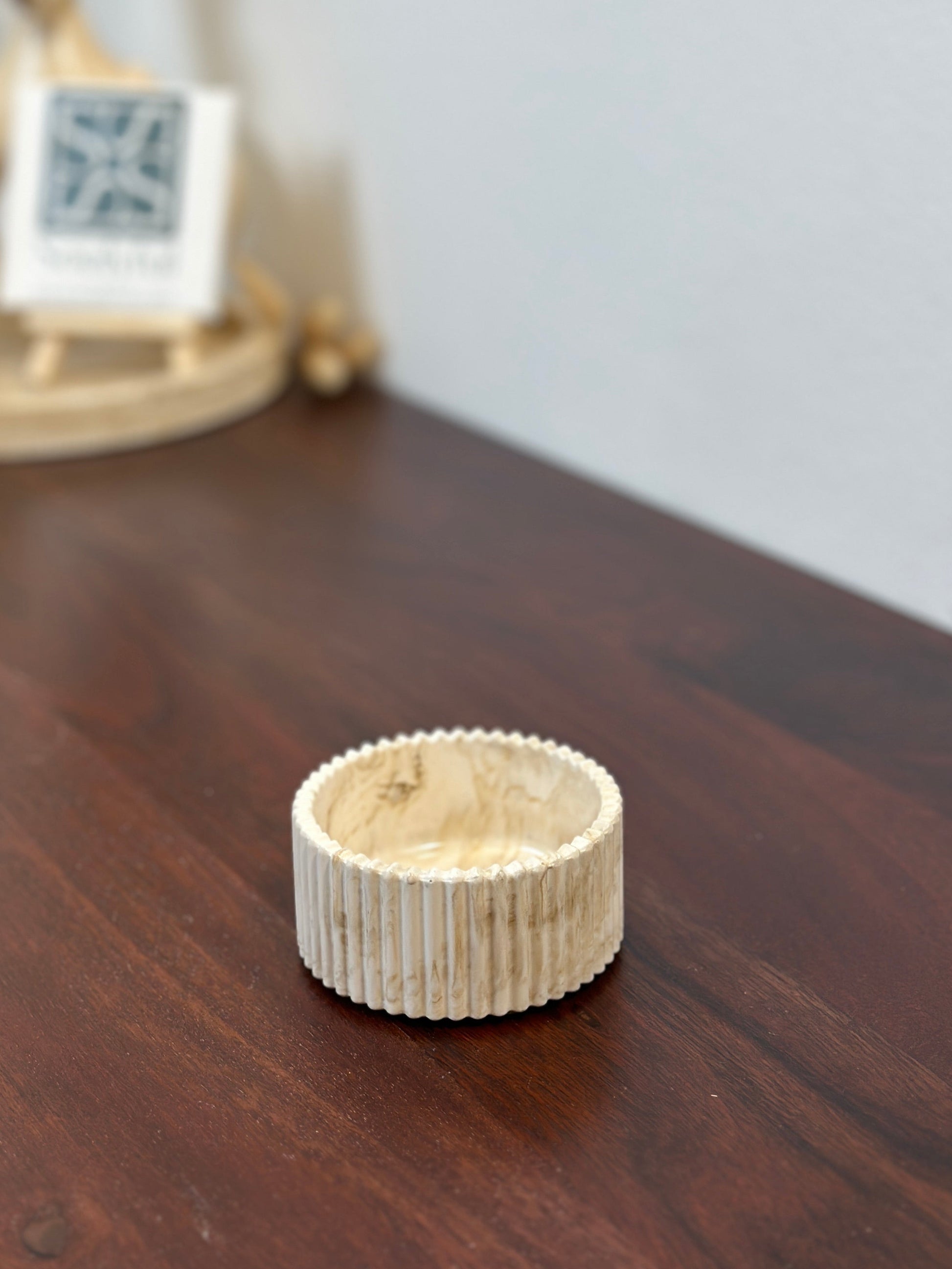 Rundes Schälchen mit geriffelter Struktur. Perfekt geeignet, um kleine Gegenstände stilvoll zu präsentieren oder einfach als dekoratives Element in deinem Zuhause. Die geriffelte Oberflächenstruktur verleiht dem Schälchen ein besonderes Flair.