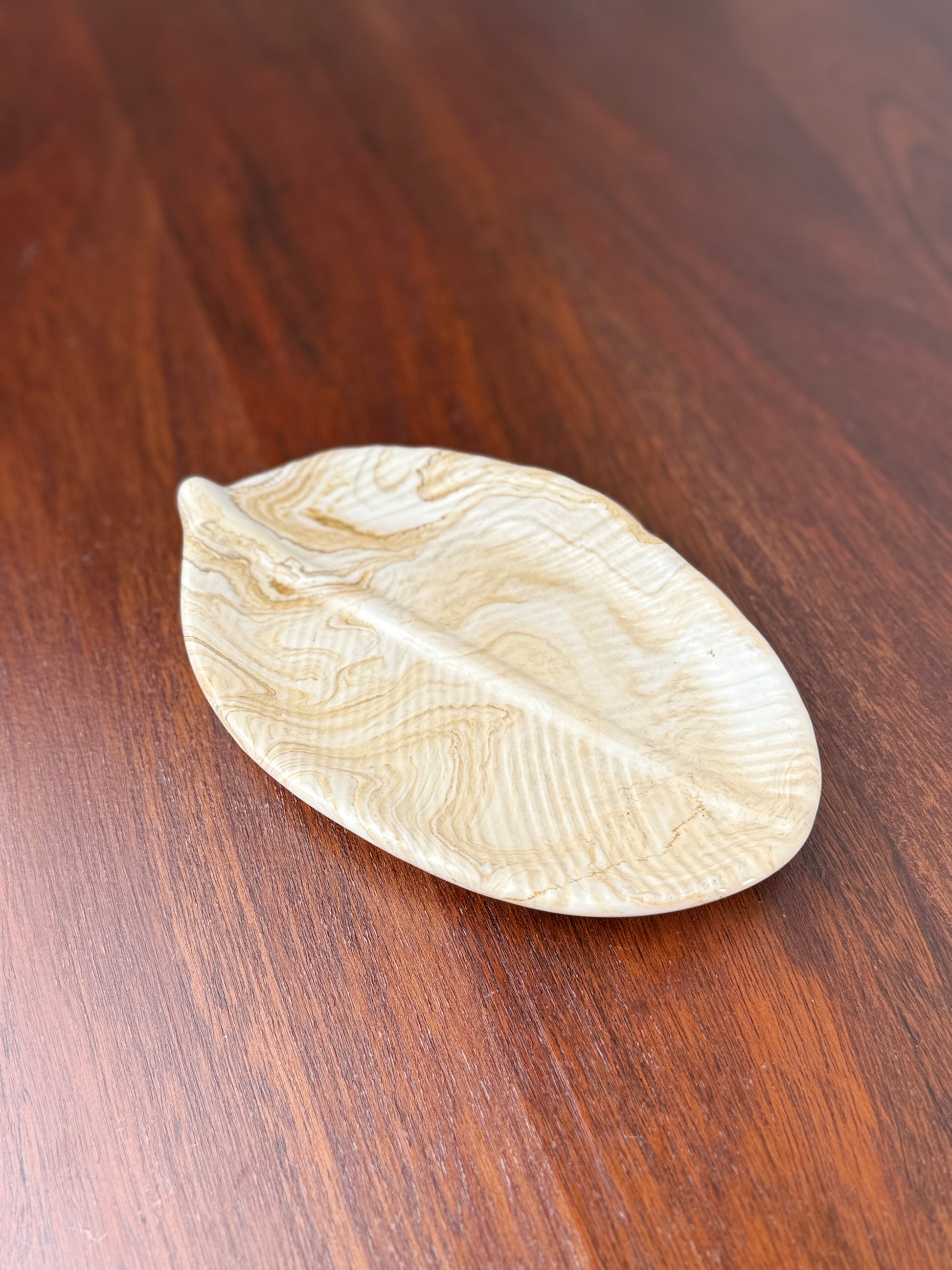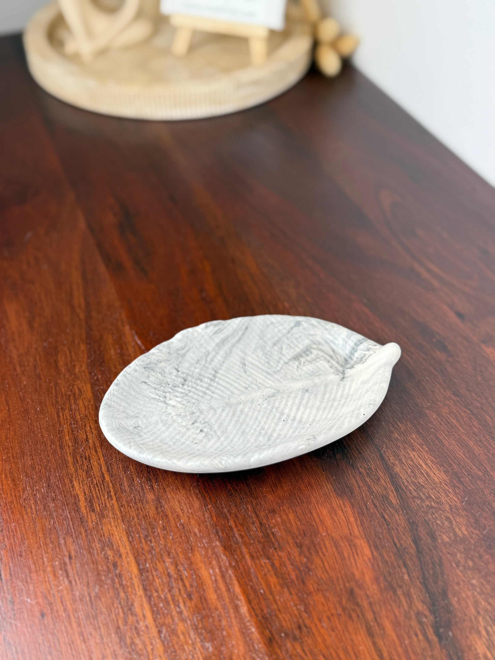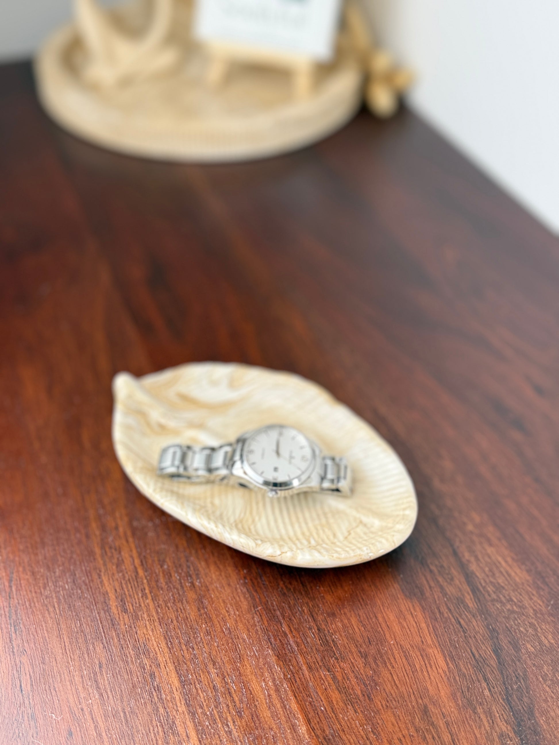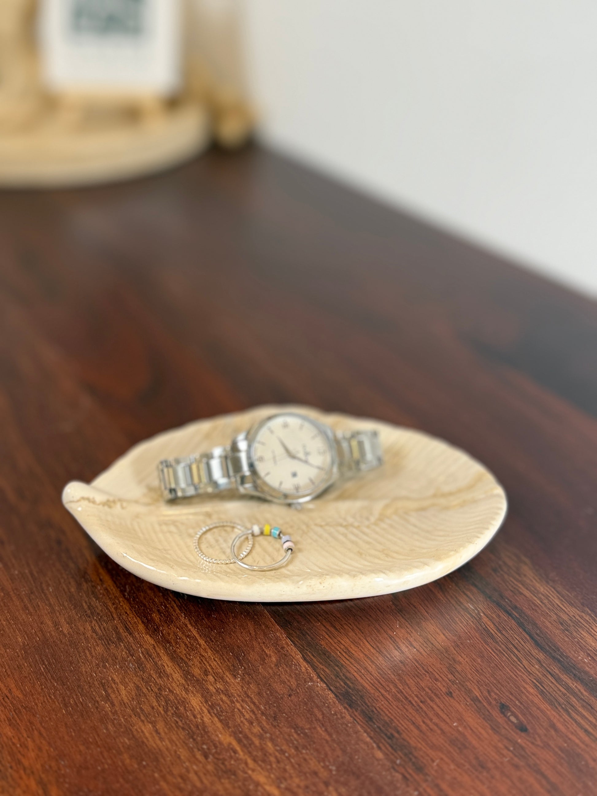 Die feine Blattstruktur, die sanfte Wölbung und die leichte Asymmetrie verleihen dem Schälchen einen authentisch organischen Charakter. Perfekt geeignet, um Schmuck, Schlüssel, deine Uhr oder kleine Alltagsbegleiter stilvoll abzulegen – sei es auf dem Nachttisch, im Bad oder auf deiner Kommode im Eingangsbereich.
